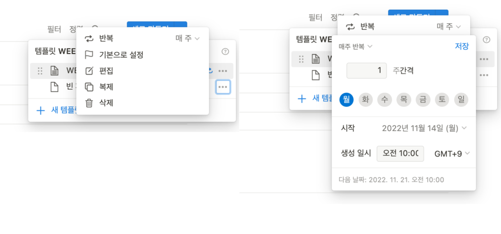 매일 반복은 월화수목금토일 매번 생성되기 때문에 개인적으로 사용하는 템플릿을 쓰는게 아니라 회사에서 사용하는 회의록 같은거라면 반복 주기를 ‘매주 반복’으로 설정을 하고 월화수목금을 선택해주시면 됩니다.