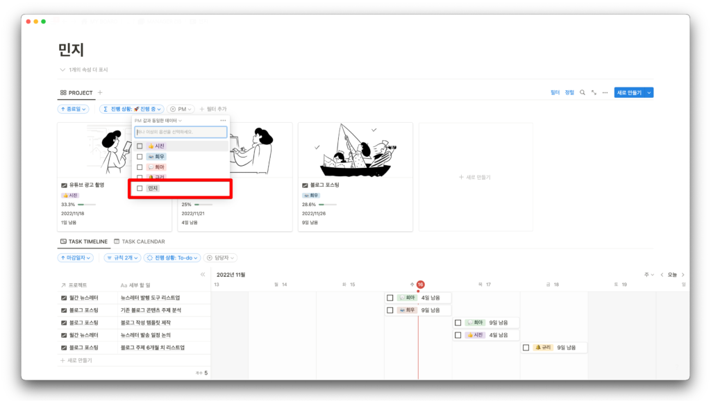 마지막은 MANAGER DB입니다. 담당자 본인이 자기가 맡은 할 일과 프로젝트를 볼 수 있는 공간이죠. 본인의 이름을 클릭해서 들어가보죠.