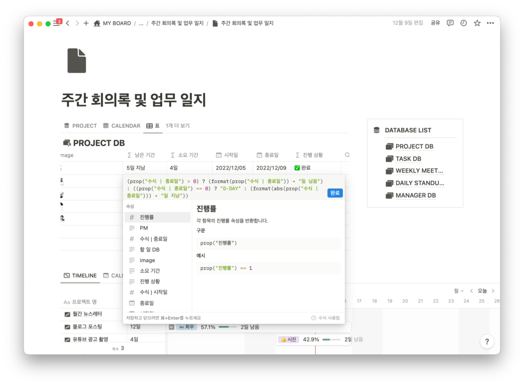 만들어진 데이터베이스 페이지로 들어오면 이미 만들어둔 템플릿을 이용해 주간 회의록을 작성할 수 있습니다. 대시보드와 비슷한 듯 아닌 듯 보이는데요, 최상단에 있는 프로젝트 DB는 같습니다. 현재 진행 중인 프로젝트를 볼 수 있고, 바로 아래에는 프로젝트의 진행 상황이 아니라 TASK의 진행 상황을 보여줍니다. 이번주에 어떤 TASK를 누가 해야하는지, 어떤 프로젝트에 필요한 TASK인지, 대시보드와 마찬가지로 타임라인과 캘린더 형태로 볼 수 있습니다. 타임라인에는 각 할 일의 담당자와 해당 프로젝트가 며칠 남았는지 한 눈에 파악할 수 있고, 회의록을 보다가 할 일을 완료했습으면 타임라인 속성에 있는 할 일 옆 체크박스에 체크를 하시면 할 일이 완료되어 보입니다.