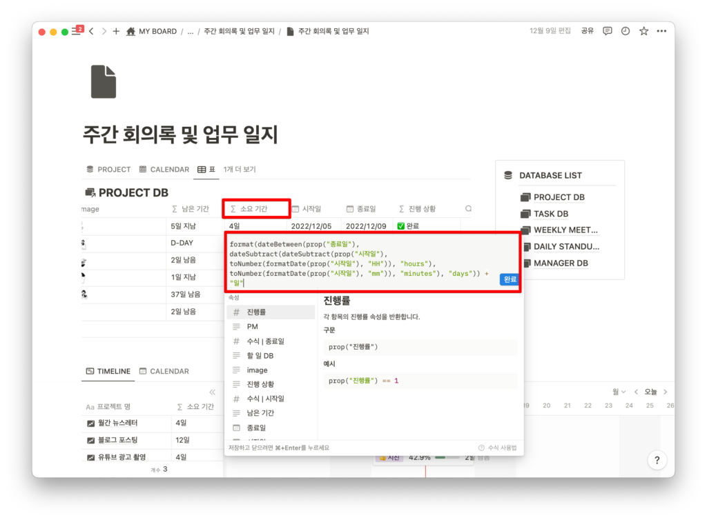 주간 회의록에 들어가는 남은 기간과 소요 기간 수식을 업데이트했습니다. 이전에는 오늘 업무가 종료되어도 하루가 남는다고 표시되었거나, 하루가 남았는데 오늘이라고 표시되는 오류가 있었어요. 이 오류는 now() 함수를 사용했을 떄, 시, 분, 초까지 모두 반영했기 때문에 나타나는 오류였습니다. 아래 내용으로 업데이트하시면 여러분들이 예상했던대로 남은 기간과 소요 기간이 딱딱 표시될거예요!