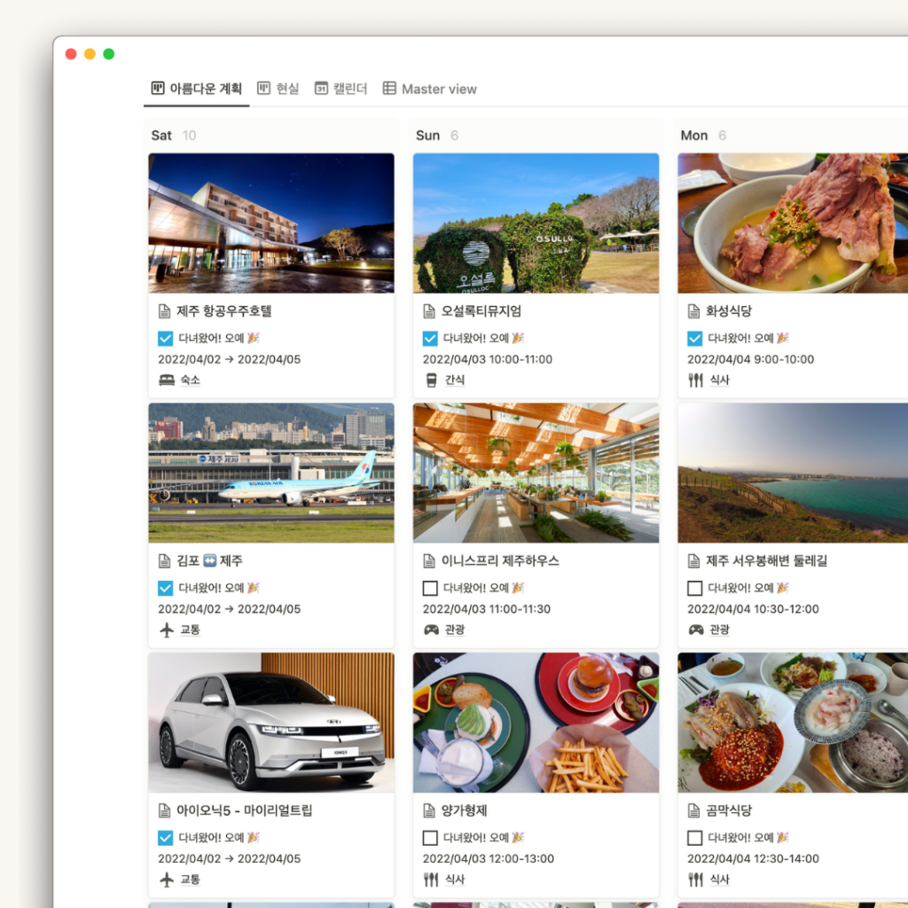우리의 소중한 여행 지금까지 어떻게 기록하셨나요? 핸드폰에 있는 사진첩이 다였다고요? 우리의 여행은 결과만 중요한게 아니라 과정까지 모두 소중하답니다. 여행을 가기 전 계획을 세울 때 그 설렘은 이루 말할 수 없죠. 노션 여행 계획 템플릿 어떠신가요?