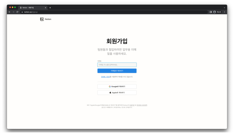 노션 회원가입 페이지에 들어오면 세 가지 방법으로 회원가입을 할 수 있습니다. 구글, 애플, 이외 다른 메일 주소이며, 자신이 원하는 계정으로 회원가입을 진행하시면 됩니다. 구글 계정의 경우 크롬 브라우저의 로그인 계정과 연동되어 구글 드라이브의 문서를 쉽게 편집할 수 있고, 회원가입 절차가 상대적으로 간단하기 때문에 구글 계정을 추천드립니다.