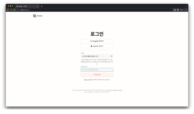 ‘이메일로 계속하기’ 버튼을 누르면 임시 로그인 코드를 보냈다면서 메일함을 확인해보라고 합니다.
