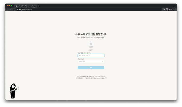 비밀번호는 구글이 아닌 계정으로 노션에 로그인할 때 필요한 방식이며, 한 번만 입력하고 넘어가기 때문에 비밀번호 입력란 오른쪽에 눈 모양을 눌러 자신이 입력한 비밀번호가 맞는지 확인한 다음 ‘계속’ 버튼을 눌러줍니다.
