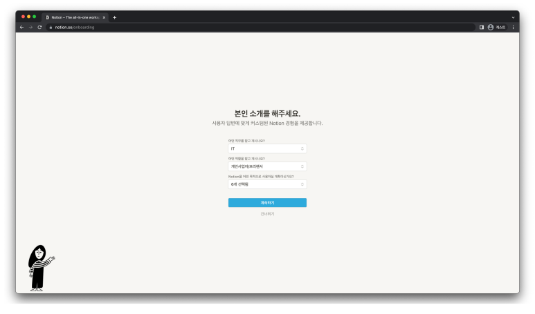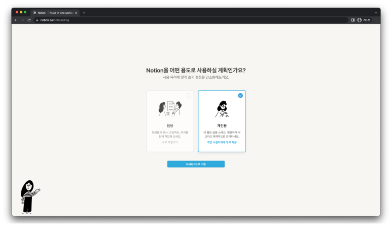 Notion을 어떤 용도로 사용하실 거냐고 묻는데, 팀원들과 함께 사용하든 혼자 사용하든