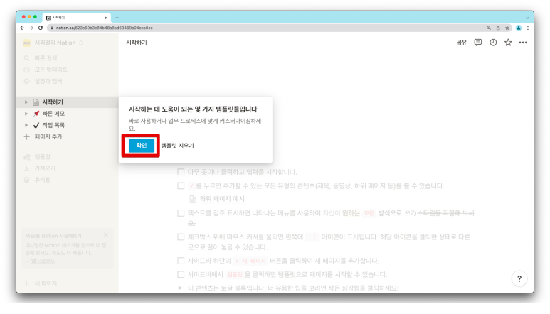 ‘확인’ 버튼을 누르면 바로 노션을 이용할 수 있습니다.