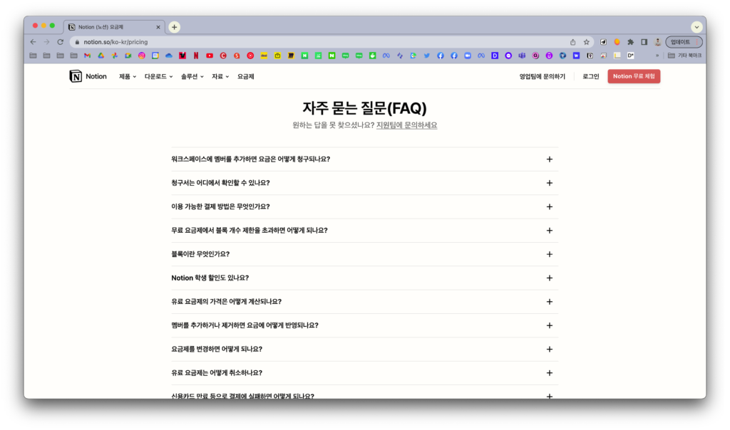더 궁금하신게 있으시다면 노션 가격 페이지에서 자주 묻는 질문을 살펴보세요. 많은 사람들이 궁금해하는 내용들이 있습니다.