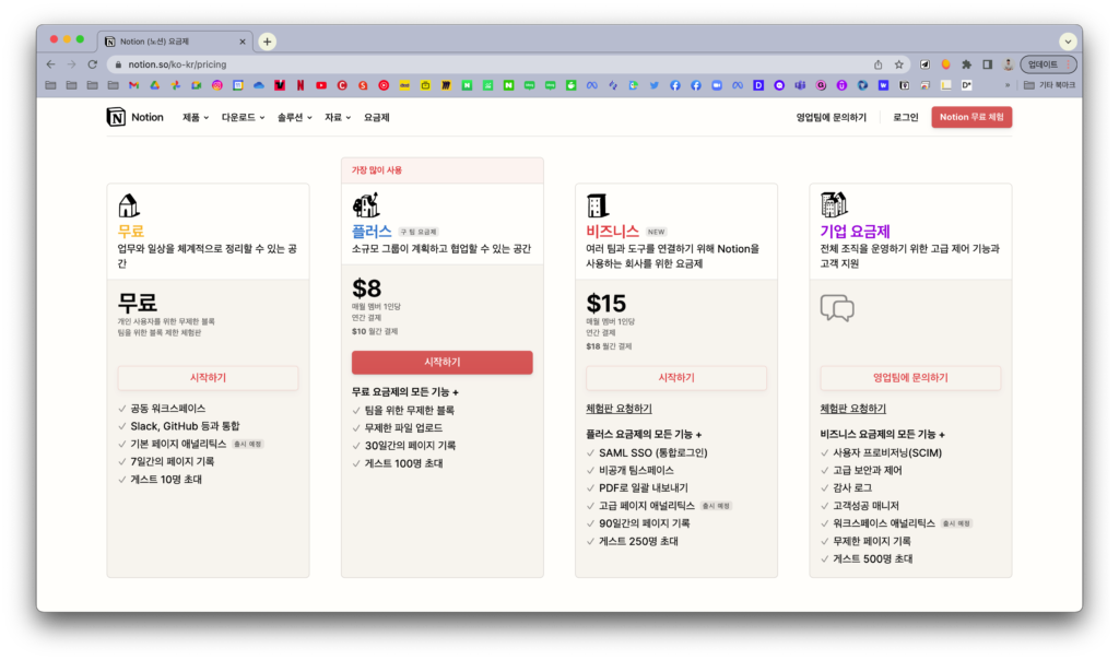 2022년 12월 7일, 노션 요금제가 대규모 개편되었습니다. 기존에 월 $4(연 결제 시) 인 개인 프로 요금제가 없어지고 무료 요금제로 통합되었어요. 그래서 현재는 무료, 플러스, 비즈니스, 기업 요금제 4개로 구성되어 있습니다.
