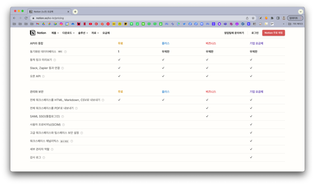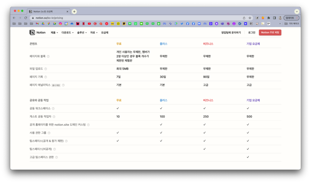 기존에 있던 개인 요금제와 개인 프로 요금제가 합쳐졌습니다. 월 $5만 내고 사용하던 페이지 기록 30일, 게스트 초대 무제한이 사라졌지만 무료 요금제에서도 페이지 기록 (7일)을 이용할 수 있고 게스트 초대도 5명에서 10명으로 증가했죠.